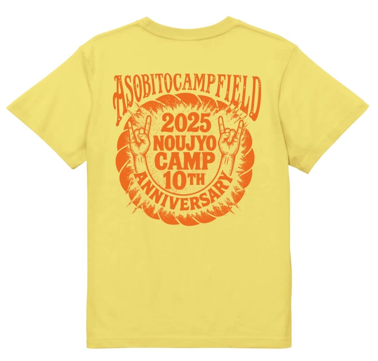 10周年の特別な瞬間を演出する、2025 NOUJYO CAMPオリジナルTシャツ(イエロー)。